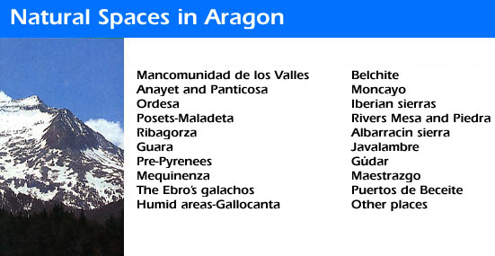 NATURE OF INTEREST IN ARAGON, MANCOMUNIDAD DE LOS VALLES / ANAYET Y PANTICOSA / ORDESA / POSETS - MALADETA / RIBAGORZA / SIERRA DE GUARA / PREPIRINEO / MEQUINENZA / GALACHOS DEL EBRO / ZONAS HUMEDAS - GALLOCANTA / ESTEPAS DE BELCHITE / MONCAYO / SIERRAS IBERICAS / RIOS MESA Y PIEDRA / SERRANIA DE ALBARRACIN / SIERRA DE JAVALAMBRE / SIERRA DE GUDAR / EL MAESTRAZGO / LOS PUERTOS DE BECEITE / OTHER PLACES OF INTEREST